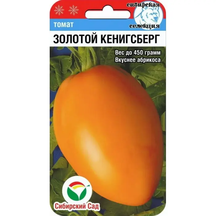Золотистый брат полюбившегося всем садоводам сорта Кенигсберг! Среднеспелый сорт для теплиц и пленочных укрытий. Растение индетерминантное, высотой 1,5-1,8 м, в открытом грунте 1,2-1,5 м. Характеризуется хорошей завязываемостью плодов в теплице. Соцветия формируются через лист. Сорт обильный, на кисти до 5-6 плодов овально-удлиненной формы, золотистого цвета, массой до 300 г, первые до 450 г. Плоды очень ровные, плотные, малосеменные, по вкусу и высокому содержанию каротина их можно назвать «сибирскими абрикосами». Прекрасно подходят для употребления в свежем виде и цельно-плодного консервирования. В период плодоношения сорт требует усиленных органо-минеральных подкормок.