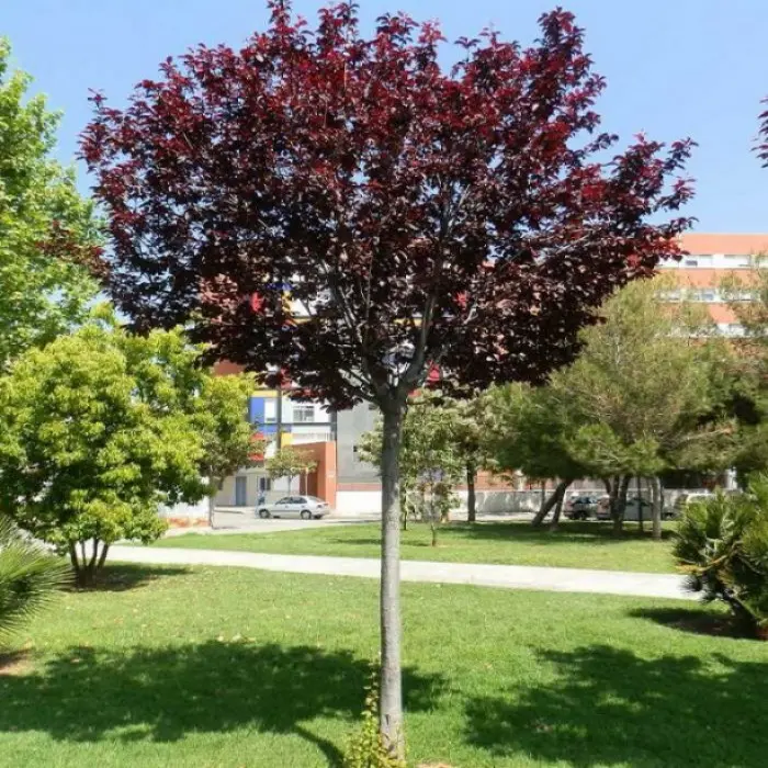 Слива Растопыренная Pissardi. Дерево высотой до 5-8 м с овальной кроной, листья тёмно-багряные с металлическим блеском, не меняют своей окраски в течение всего сезона, цветки розовые, плоды мелкие, вишнёво-красные, малосъедобные, для солнечных и полутенистых мест с защитой от зимних ветров, сорт устойчив к засухе, не переносит избыточного увлажнения, может использоваться в качестве стриженой живой изгороди. Листовые пластинки отличаются эллиптической формой, их длина может составлять в среднем 5-6 сантиметров. Окраска у них красная либо багровая, на их поверхности можно наблюдать легкий металлический блеск. Расцветка будет оставаться неизменной на протяжении всего вегетационного периода.