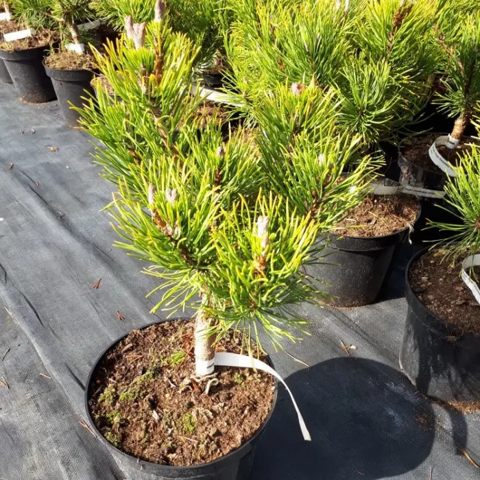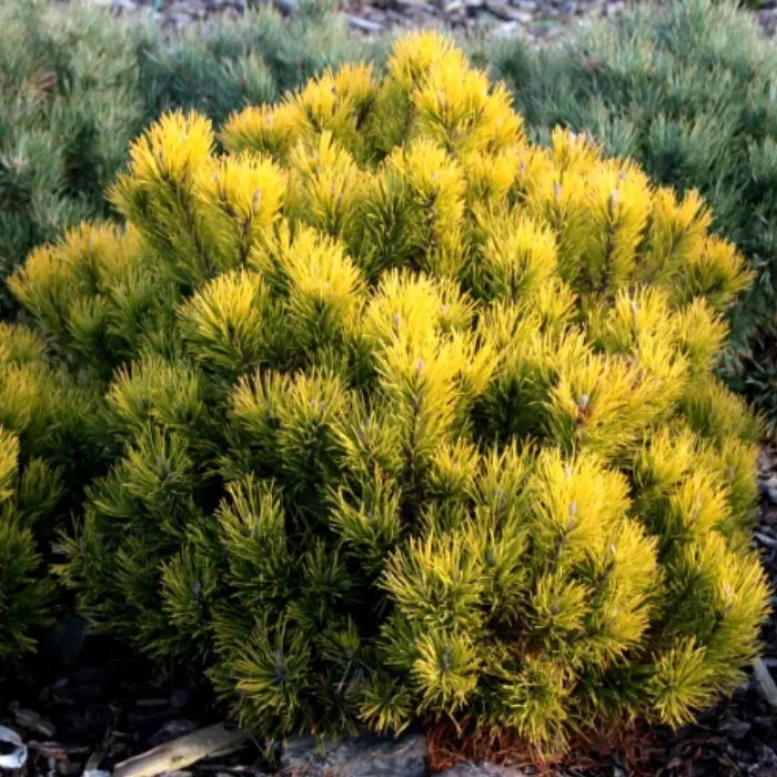Сосна горная Dezember Gold. Карликовый подушковидный сорт, к 10-ти годам высота 30 см, диаметр 40 см. Хвоя короткая, жёсткая, немного изогнутая и слегка скрученная, собрана по 2 хвоинки, ярко-зелёная летом, золотисто-жёлтая осенью и зимой. Место только солнечное. Чувствительна к уплотнению почвы. Переносит обрезку молодых побегов. Рекомендуется для альпинариев и контейнеров. Зона 4 (до -29°С).