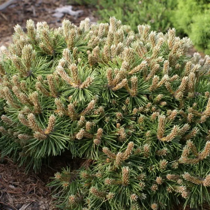 Сосна горная Gnom Findling. Дерево или крупный кустарник с густой, шаровидной кроной. Высота 1,5-2 м, ширина 2 м. Растет медленно. Не нуждается в обрезке. Хвоя игольчатая, темно-зеленая, густая, до 4 см длинной. Местоположение: Солнце. К почве нетребовательна, лучше растет на свежих, хорошо дренированных суглинках и супесях. Выносит засоление и застой влаги. Морозостойкость до -35.