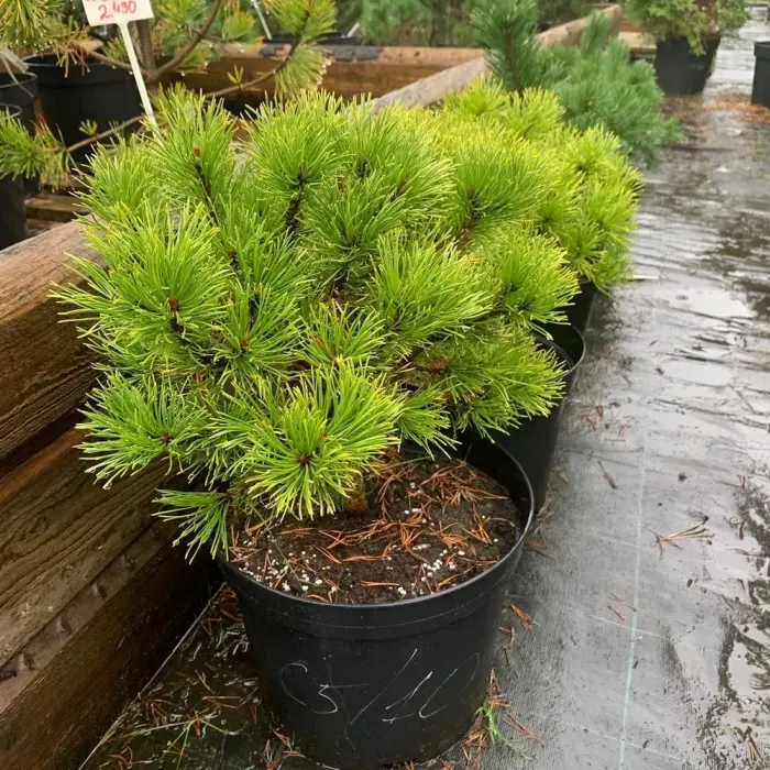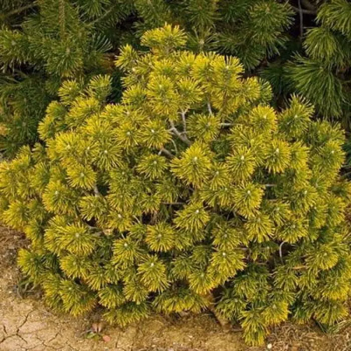 Сосна горная Carsten's Wintergold. Карликовая, кустарниковая, медленно растущая форма сосны, достигающая после 10 лет около 0,5 м при диаметре 1 м. Похожа на сорт сосны Офир. Летом хвоя светло-зеленого цвета, зимой золотисто-желтая, собранная по две хвоинки. С наступлением холодов аккуратный светло-зеленый шарик вдруг начинает перекрашиваться в яркий золотисто-коричневый цвет, который сохраняется в течение всей зимы и добавляет оптимизма и тепла в унылый пейзаж.