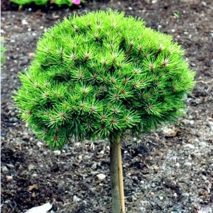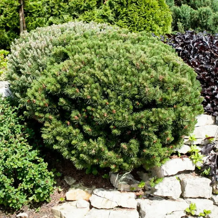 Сосна горная Lilliput. В 10 лет высота и диаметр 0,5-0,6 м. Позже вырастет до 1 м. Темп роста медленный, по 2-4 см в год. Хвоя темно-зеленая, короткая, жесткая.