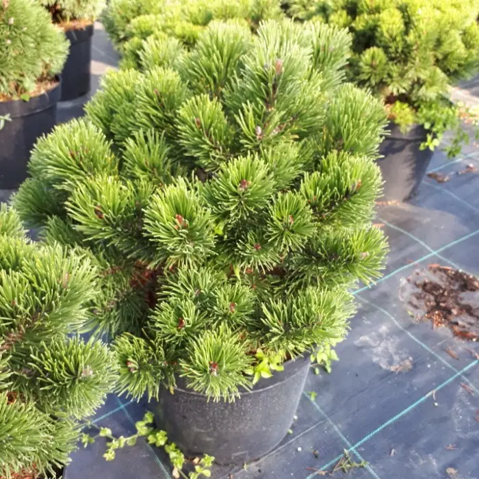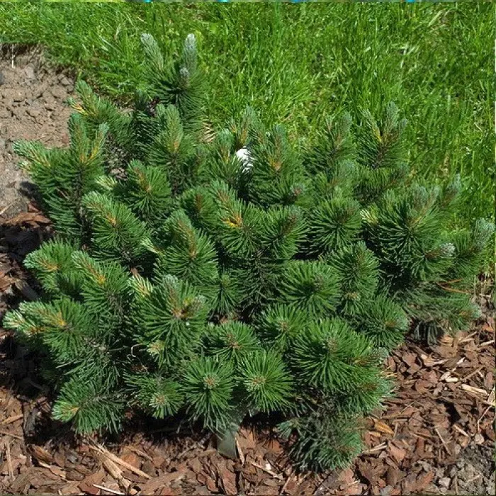 Сосна горная March. Яркие карликовые деревца, издали похожие на мягкие хвойные подушки. Крона растения необычайно густая, сбита из длинной скрученной хвои собранной попарно. Сорт устойчив к неблагоприятным погодным услоям, снегу, льду.