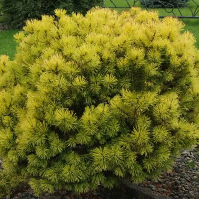 Сосна горная Ophir. Карликовый хвойный кустарник с подушковидной округлой кроной. В 10-летнем возрасте достигает высоты 0,5 м и около 1 м в диаметре.
