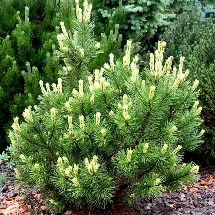 Сосна горная Pal Maleter. Красивый многовершинный кустарник, растёт медленно, к 10-ти годам высота 100 см, диаметр 100 см. Хвоя длиной 3-5 см, по 2 в пучках, очень колючая, летом - тёмно-зелёная. Молодой прирост кремово-белого цвета. Место солнечное. К почве и влаге малотребователен. Засухоустойчив. От снегопада не страдает. Рекомендуется для одиночных и групповых посадок, альпинариев. Зона 3 (до -34°С).