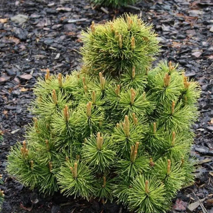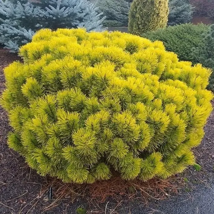 Сосна горная Wintersonne. Чрезвычайно выносливый карликовый сорт. Растёт медленно, к 10-ти годам высота 70 см и ширина 150 см. Годовой прирост 7-15 см. Крона компактная. Хвоя летом зелёная, при понижении температуры осенью приобретает золотисто-жёлтый цвет. Отлично подходит для контейнеров и каменистых садиков. Карликовая, широко-вертикальная форма. Хвоя: в течение лета иглы имеют зеленый цвет, приобретают интенсивный желтый цвет на зиму. Светолюбива, переносит полутень. К влаге и почве мало требовательна. Морозостойка и ветроустойчивая. Деревья без проблем переживают заморозки вплоть до -40 °C.