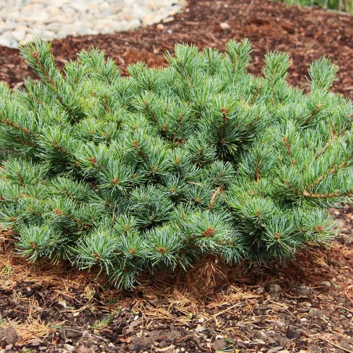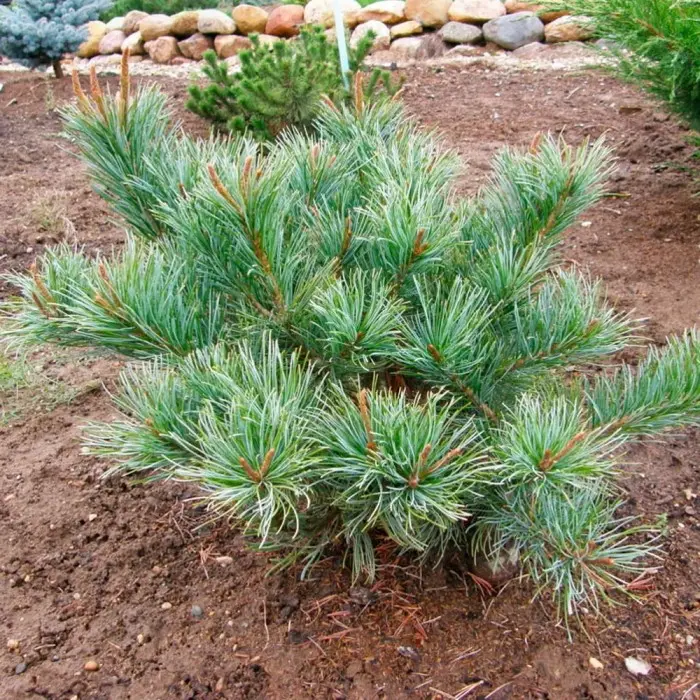Сосна кедровая Vete-Haka. Густо ветвящаяся широко-кустистая сосна. Во всём похожа на Pinus pumila ‘Glauca’, только хвоинки другой формы. Растёт очень медленно, к 10-ти годам высота 100 см, диаметр 160 см. Побеги изогнутые, приподнимающиеся. Хвоя серебристо-голубая, длинная, собрана по 5 хвоинок, густо покрывает ветки. Мужские соцветия на молодых приростах очень красивые, яркие, тёмно-красные. Место солнечное. Застоя воды не выносит. Очень популярное растение для альпийских горок и контейнеров. Зона 3 (до -34°С).