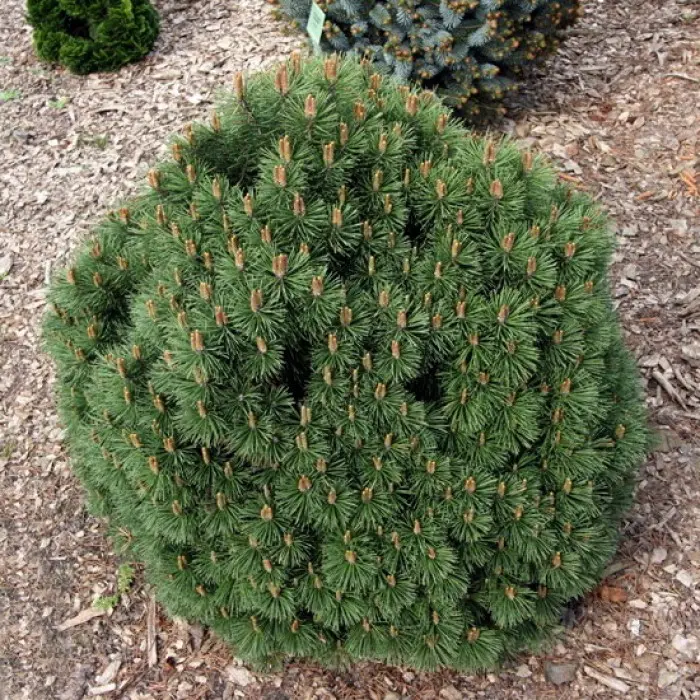 Сосна крючковатая Hnizdo. Карликовая, медленнорастущая форма сосны. В 10 лет высота около 0,6 м. Годовой прирост 4-5 см. Крона сначала округлая, позже подушковидная, очень плотная и ровная. Ветки короткие, густые. Хвоя ярко-зеленая, короткая 1-2 см.