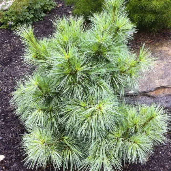Ветки расходятся пучком, по 5-6 штук, образуя красивые густые шары, что делает этот сорт легко узнаваемым. Хвоинки мягкие, очень длинные, серебристо-сине-зеленого цвета, по пять в пучке. При достаточном питании сосна приобретает дополнительное украшение – многочисленные шишки, которые появляются уже у молодых растений и имеют слегка изогнутую форму.