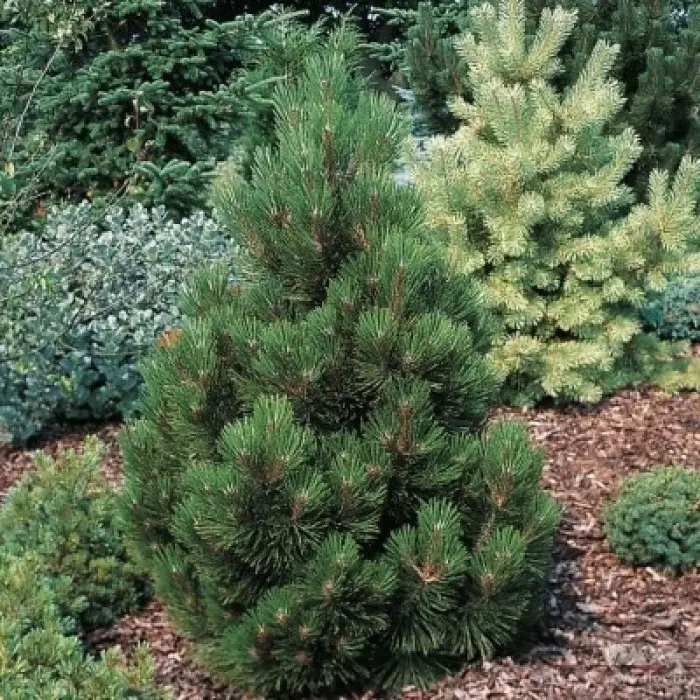 Сосна веймутова Densa Hill. Средне растущее небольшое дерево с конусовидной кроной, вертикальными ветвями, густоразветленными. Достигает около 7 м высоты и 2,5 м ширины. Хвоя голубовато-зеленая, мягкая, собрана по пять штук в пучке, длинной 10 см. Шишки цилиндрические, в молодости вертикальные, на второй год свисающие, длинной 15-25 см, светло-коричневые. Светолюбива. Нуждается в влажных, плодородных почвах.