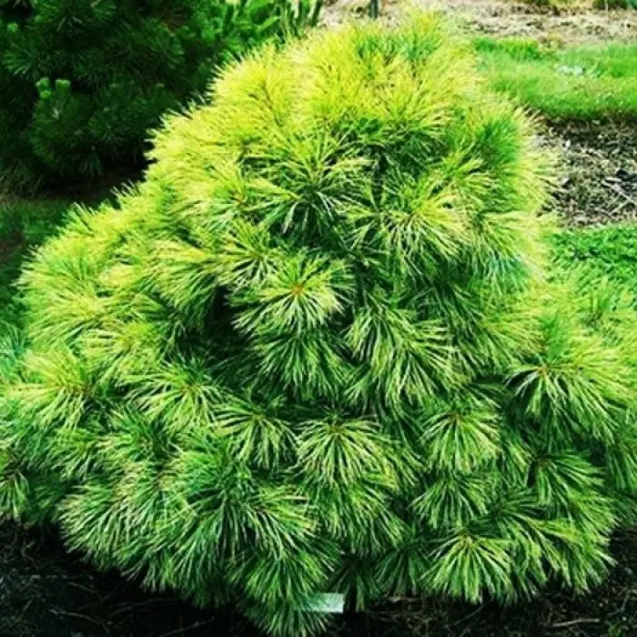Сосна веймутова Edel. Сосна сферической формы. Очень плотная. Годовой прирост 7-9 см. После 10 лет диаметр 80 см. Хвоя мягкая, тонкая, длинная, зелёно-синяя. Шишки образуются рано, уже на 2-3-летних растениях. Место солнечное. К почвам нетребовательна. Зона 3 (до 34°С).
