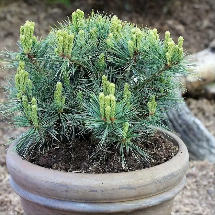 Сосна веймутова Krugers Lilliput. Карликовая сосна компактной сферической формы, к 10-ти годам высота и ширина 60 см. Годовой прирост 6 см. Хвоя мягкая, серо-голубая, длиной 2-4 см, примерно в 2 раза короче, чем у других сортов сосны Веймутова, собрана в пучки по 5 хвоинок. Молодая хвоя светло-зелёная. Отлично подходит для бонсай. Прищипкой можно добиться меньшего размера и более плотного габитуса. Место солнечное. Почва умеренно влажная, дренированная. Зона 3 (до -34?).