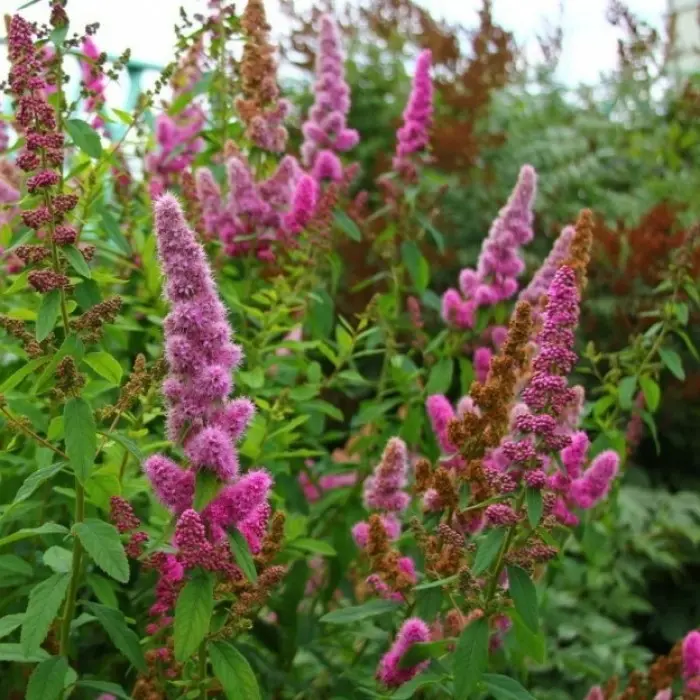 Среди поздних спирей наиболее эффектна спирея Billardii – гибридный сорт спирее иволистной. Это высокий куст, до 2,5 м с длинными, прямыми, раскидистыми ветвями. Молодые побеги тонкие, покрыты листьями по всей длине, растут вертикально. Старые побеги голые, ребристые. Листья с пильчатым краем, широколанцетные, до 10 см длиной, снизу серовато-войлочные. К осени листья становятся буровато –красными. Цветки мелкие, приятного ярко-розового цвета со сладковатым ароматом образуют узкие густые метельчатые соцветия, достигающие 20 см длиной! Цветет со второй половины лета до поздней осени.