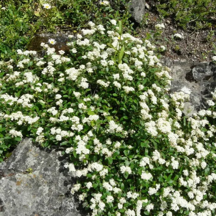 Спирея decumbens. Карликовый кустарник высотой 15-25 см, шириной 75 см. Побеги многочисленные, стелются по земле, приподнимаясь на кончиках. Листья длиной 3-4 см, зубчатые, эллиптические. Цветки крошечные, белые, в щитковидных соцветиях диаметром 5 см. Цветение в июне.