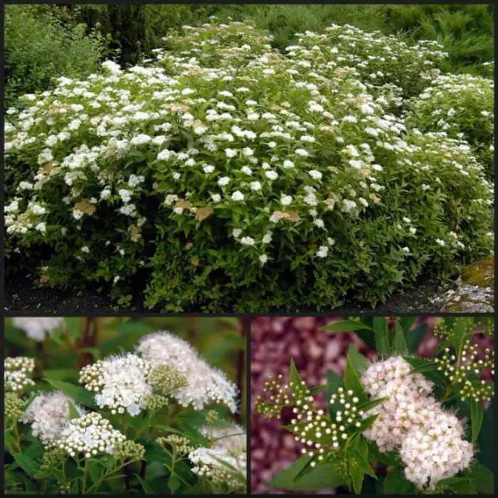 Спирея японская Albiflora. Небольшой лиственный кустарник, около 80 см в высоту. Диаметр куста составляет в среднем 1,5 м, крона раскидистая, густая. Ежегодный прирост составляет всего 10 см. Листва окрашена в нежные зеленые тона, однако, в сентябре листья желтеют и постепенно приобретают ярко-оранжевый цвет. Цветы у спиреи японской сорта Альбифлора мелкие, собраны они в плотные щитковидные соцветия, диаметр которых не превышает 6-7 см. Окрас лепестков белый. Одной из ведущих характеристик сорта является обильное цветение, которое продолжается с июля по август.