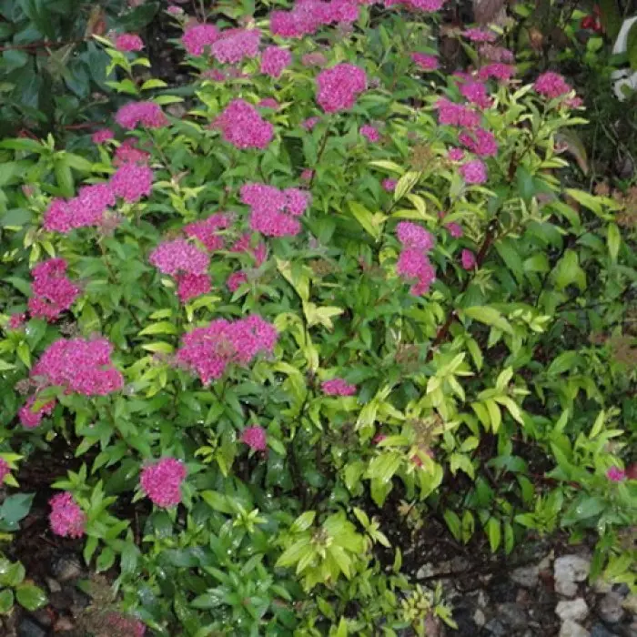Спирея японская Dart's Red. Компактный кустарник высотой 60-80 см. Листья ланцетные, расположены очередно, светло-зеленые, при распускании красноватые. Цветки от ярко-розовых до рубиново-красных. Собраны в многочисленные, крупные, плоские соцветия, которые появляются на верхушках побегов текущего года с июня по сентябрь. Может цвести повторно, но уже не так обильно. Светолюбива, к почвам нетребовательна, морозостойкая. Рекомендуется для изгородей, бордюров, в групповых или одиночных посадках, в группах деревьев с ажурными кронами. Хорошо переносит городские условия. Рекомендуется весенняя обрезка, укорачивание побегов. Летом удаляют отцветшие соцветия для поддержания декоративной формы куста. Зона зимостойкости 4.