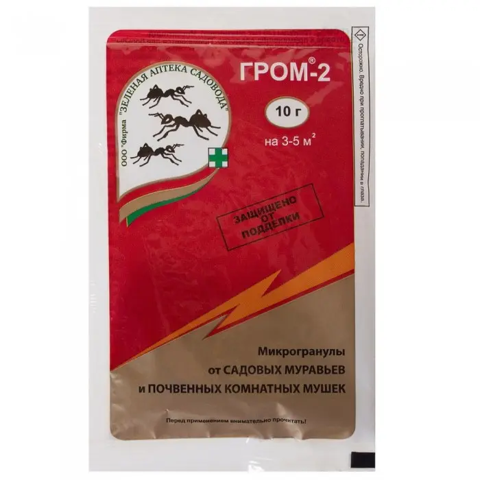 Средство от муравьев «Гром-2» — химический инсектицид, предназначенный для истребления муравьев, почвенных мошек, грибных комаров в горшках комнатных растений и на приусадебном участке. Для достижения результатов необходимо внести препарат в толщу почвы на глубину 1–2 см по пути следования муравьев или в местах скопления насекомых. Муравьи гибнут спустя 3–5 дней после контакта с действующим веществом препарата. Защитное действие сохраняется 2–3 месяца, достаточно купить препарат 1–2 раза на сезон. Упаковки в 10 г хватает для обработки 8–10 м2 почвы.