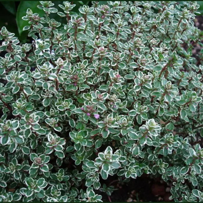 Тимьян лимоннопахнущий Silver Queen. Полукустарниковая разновидность лимонно-пахнущего тимьяна, образует низкие куртины высотой 20-30 см. Листья небольшие, овальной формы; серебристо-зеленые с белой каймой. В июне-августе растение покрывается множеством ароматных, розовато-лавандовых мелких цветочков.