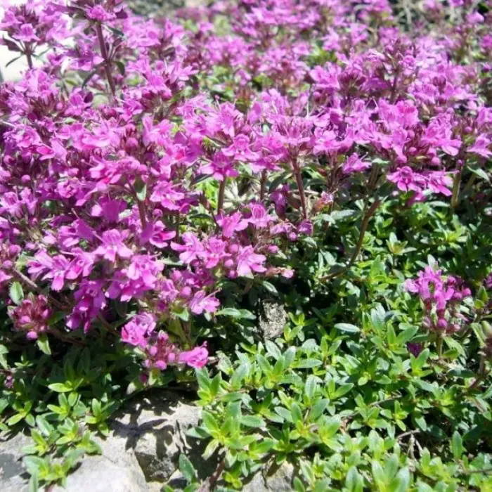 Тимьян ползучий с июня пышно цветет розовато-лиловыми цветками. Они покрывают растение полностью, образуя низкий ковер высотой 10-15 см. Все тимьяны предпочитают яркое солнце и привыкли к засушливым условиям. В тени побеги становятся вытянутыми, окраска листьев бледнеет, а куст выглядит более рыхлым. Поэтому выберите для тимьяна открытый южный склон, где растения будут накапливать больше эфирного масла, в котором и заключена его целебная сила.