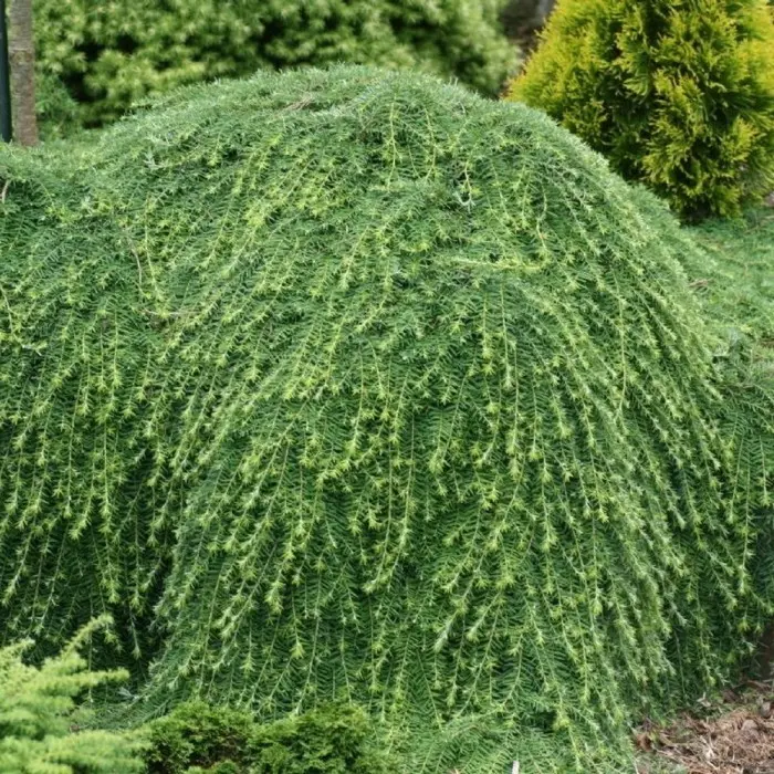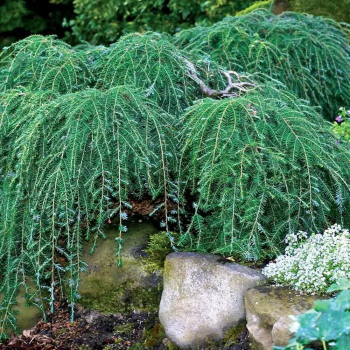 Тсуга канадская Cole`s Prostrate. Медленнорастущая карликовая форма, которую обычно выращивают в качестве почвопокровного растения. Стелется по земле, как правило, со временем обнажаются голые ветки в центре. Серебристо-белая кора ветвей хорошо контрастирует с темно-зеленой игольчатой ??листвой. К 10-ти годам высота всего 10 см, ширина 80 см. Растения будут спускаться по склонам, расползаться по ровной поверхности, ползать по более мелким камням или переползать через край стены.
