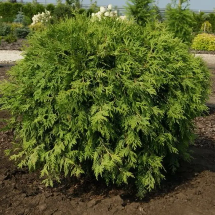 Форма кроны: овальная, плотная. Хвоя чешуйчатая, мелкая, плотно прижатая к побегу, зелёного цвета.