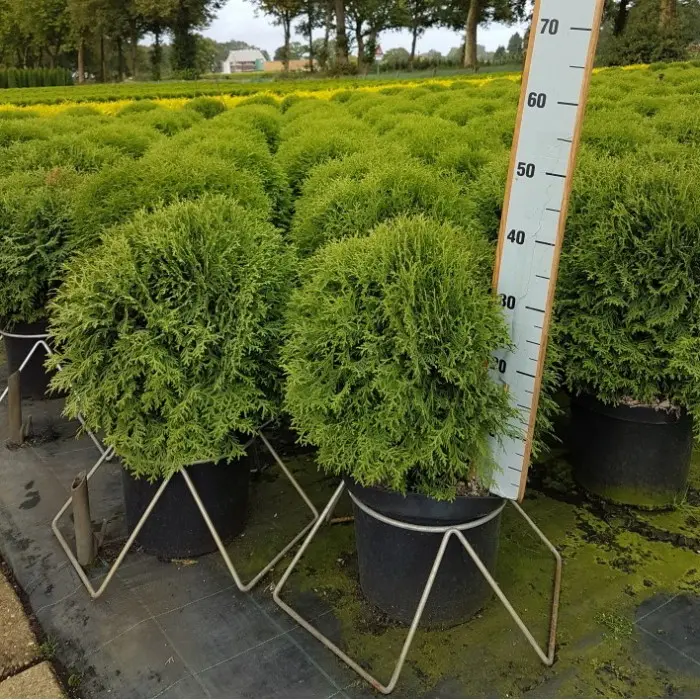 Туя западная Little Giant. Карликовый вечнозеленый кустарник. Шаровидная плотная крона достигает максимальной высоты 0,8 м, диаметра – 0,4 м. В период активного роста цвет листвы ярко-зеленый, к зиме хвоя принимает бронзовый оттенок. Побеги густые, частые. Растет очень медленно. Устойчивая симметричная форма и миниатюрный размер делают сорт популярным.