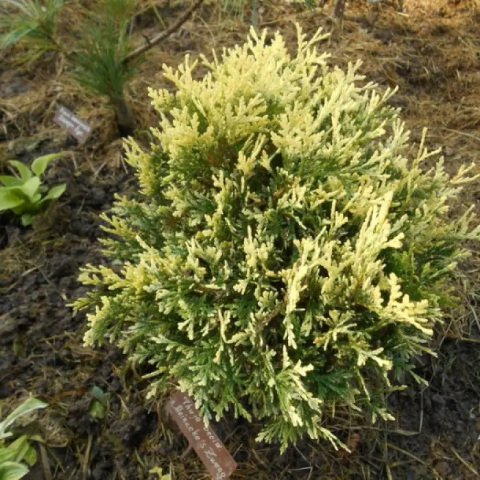 Туя западная Meineckes Zwerg. Карликовый сорт. Крона рыхлая, почти сферическая, часто многоконическая. Растёт медленно, высота в 15 лет – 60 см. Ежегодный прирост – 5 см. Побеги многочисленные, жёсткие, прямостоячие. Молодая хвоя с кремово-белыми пятнами или окаймлением, потом – зелёная. Место полутенистое. Рекомендуется для альпинариев, малых садов, контейнерного выращивания. Зона 5 (до -23?С).
