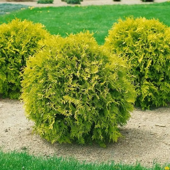Туя западная Mirjam. Хвойный медленнорастущий кустарник шаровидной формы. Настоящий хвойный карлик, вырастающий не более 0,8 м в диаметре. Крона плотная, листва желтая, чешуевидная. Зимой хвоя приобретает бронзовый окрас, весной снова становится ярко-желтой. Благодаря симметричной устойчивой форме и золотистой листве thuja occidentalis Mirjam стала очень популярна в Европе. Несмотря на то, что это сравнительно новый сорт (мутант сорта Danica), туя Мириам довольно часто встречается в качестве цветового акцента в небольших придомовых садах и на газонах в европейских городах и парковых зонах.