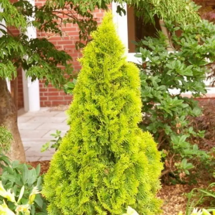 Туя западная Sunny Smaragd. Коническая форма с регулярной кроной. Похожа на «Smaragd», но с золотисто-зелёной хвоей. Растёт быстро, к 10-ти годам высота 2,5-3 м.