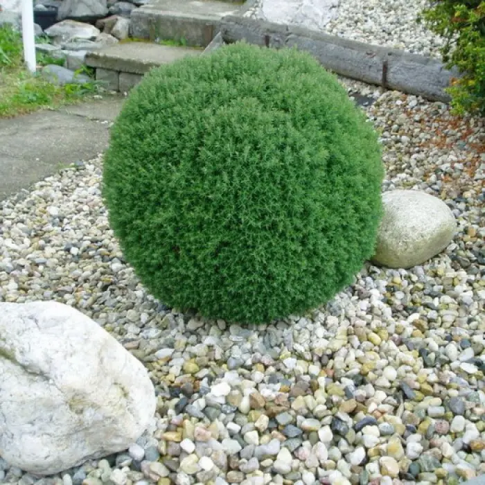 Туя западная Teddy. В 10 лет достигает 0,3 м в диаметре. Зимостойка, зона 5 USDA (-28,8). Хвоя молодая игольчатая, но не колючая, тонкая, темно-зеленая. У взрослых растений бывают побеги с чешуевидной хвоей. Растет медленно.