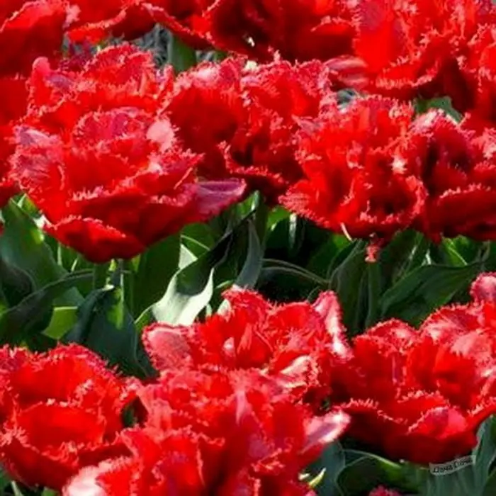 Тюльпан Лион Кинг бахромчатый. Цветет в конце мая, образуя насыщенный карминно-красный цветок, с красивой и изящной бахромой на кончиках лепестков, высота бокала 7-8 см ,диаметр 9-15 см. Отличительная особенность этих тюльпанов - игольчатая бахрома по краям лепестков, напоминающая иней. Высота 50 см. Легко размножается, дает прекрасную срезку.