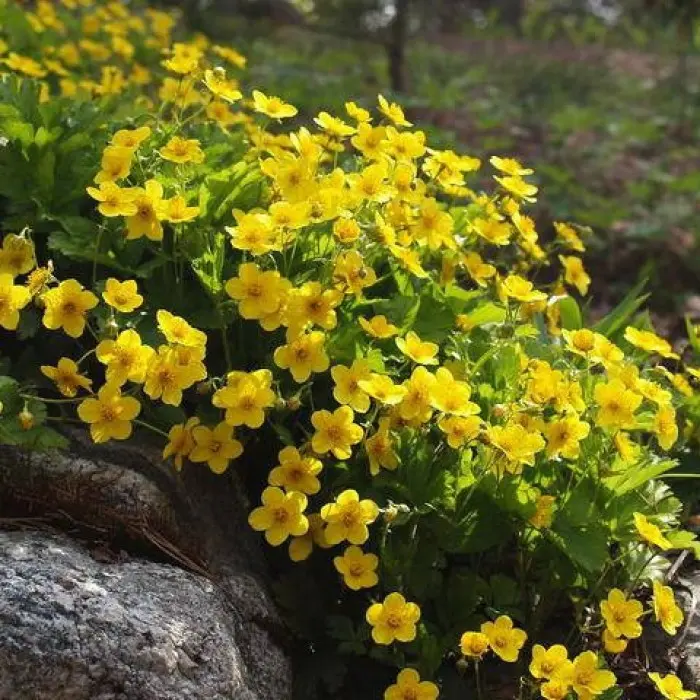 Вальдштейния Ternata. Растение для тенистого участка, относится к семейству розоцветных. Лежачие укореняющиеся побеги образуют ковер из зимующих лопастных листьев, которые осенью желтеют. Цветки с пятью лепестками похожи на цветки лапчатки и собраны в рыхлые соцветия. Высота 10 см разрастается в ширину до 60 см, цветет в мае-июне желтыми цветками диаметром 1 см.
