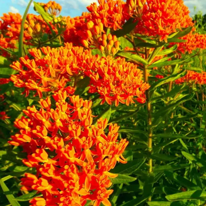 Ваточник tuberosa. Высота может доходить до 100 см. Любим цветоводами за очень эффектный вид во время цветения. Растение невысокое, его украшают ярко-оранжевые цветки, причем зонтики с крупными размерами будут украшать сад достаточно долго и не только оранжевым оттенком, но и желтым и красным одновременно. Такие цветы рекомендуется высаживать на фоне растений с обильной зеленью. Контрастные композиции будут обязательно привлекать внимание.