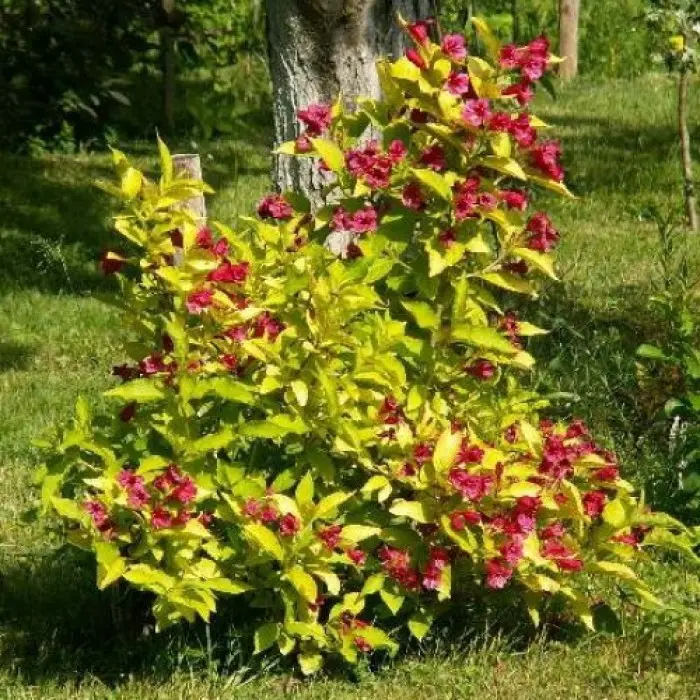 Вейгела цветущая Aurea. Кустарник до 1,5 м высотой с золотисто-желтыми листьями. Ярко-розовые цветки в изобилии появляются на коротких боковых побегах. Цветет в начале июня. Продолжительность цветения 20 дней. Листья эллиптические, заостренные на вершине, пильчатые. При хорошем освещении окраска листьев золотистая, в тени листья зеленеют. Хорошо растет на рыхлых свежих почвах, но плохо цветет на переувлажненных почвах, т.к. не выносит застоя воды. При засухе нуждается в поливе.
