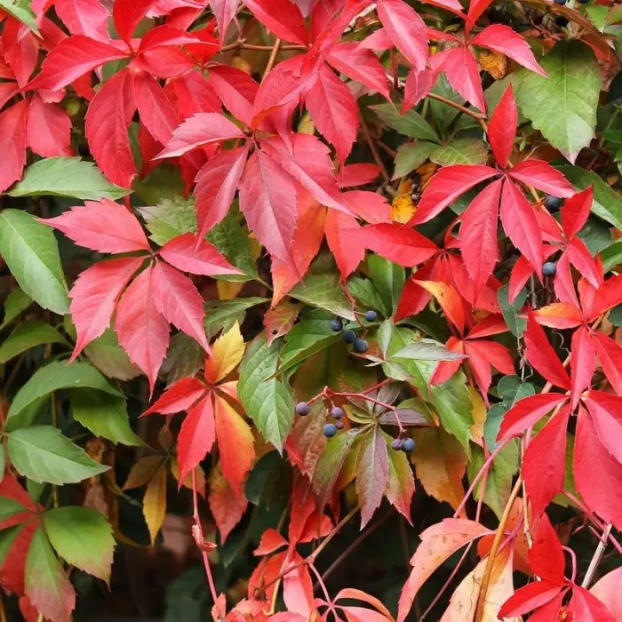 Виноград девичий. Крупная вьющаяся лиана длиной до 15-20 м. Листья пальчатые, к осени становятся бордовыми. Цветки на тонких цветоножках в 3-6-цветковых зонтиках, собранных в верхушечные соцветия. Плод – синевато-черная ягода с сизым налетом.