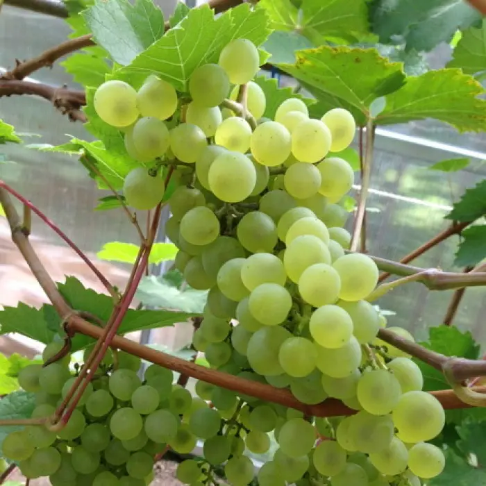 Виноград плодовый Krystall. Высокоурожайный технический сорт винограда. Срок созревания очень ранний (110-115 дней). Кусты среднерослые. Листья средние, сильноразрезные, темно-зеленые. Грозди средние, цилиндро-конические или конические, средней плотности, массой 170-200 г. Ягоды овальные, желто-зеленые или белые с пруиновым налетом, гармоничного вкуса, массой 1,5-2,1 г. Мякоть сочная, кожица прочная. Сахаристость - 17-18 %, кислотность - 6-7 г/л. Вызревание побегов очень хорошее - 90-100 %. Плодоносных побегов -85-90 %, число гроздей на побег - 1,3. Нагрузка - 60 глазков на куст при длине обрезки плодовых лоз на 3-4 глазка. Сорт винограда Кристалл повышенной зимостойкости, выдерживает до - 29°С. Устойчив к грибным болезням, серой гнилью не повреждается. Урожай сохраняется на кустах почти весь сезон. Виноград используется для приготовления сухих столовых вин типа херес.