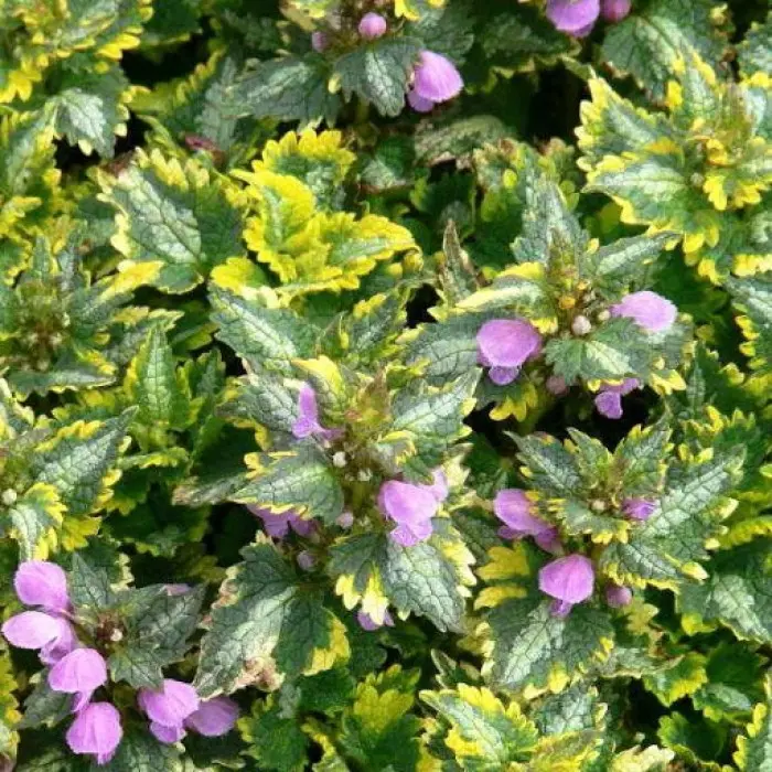 Яснотка Golden Anniversary. Многолетнее травянистое растение с длинными укореняющимися в узлах лежачими побегами и прямостоячими цветущими стеблями до 15 см высотой. Стебли, разрастаясь, со временем образуют сплошной ковер. Листья имеют ярко-желтую окантовку по краю листа и серебристую полоску по центру. Цветет в начале мая примерно 2 недели.