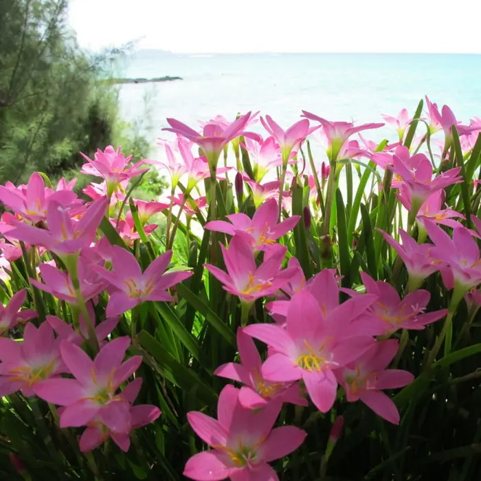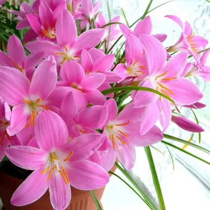Zephyranthes. Луковичное растение семейства амариллисовых с узкими, линейными листьями до 30 см длиной. Стрелка длиной до 15-20 см, несет один цветок. Растений выпускает сразу несколько цветоносов. Цветок диаметром 6 см, ярко розовой окраски. Цветочные стрелки растут очень быстро (как бы "выскакивают" из земли) и через 1-2 дня уже зацветают. Цветки держатся открытыми 5-7 дней. На зиму луковицы выкапывают или уносят в дом.