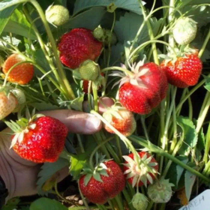 Земляника (Клубника) Кармен. Неизменно привлекающий внимание замечательно красивый среднеспелый сорт клубники Кармен из Чехии. Куст многорожковый, высокий, раскидистый. Лист красивый, резной, слегка гофрированный. Цветоносы крепкие, высокие.