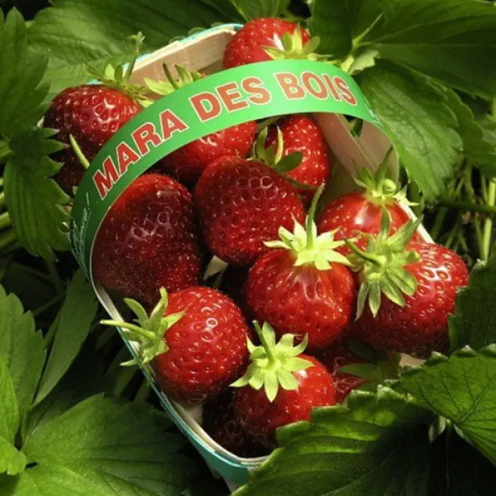 Земляника (Клубника) Mara des Bois. Ремонтантный сорт. Вкус десертный, высокого класса, многогранный – как у лесной земляники, идеально сбалансированы высокая сахаристость и приятные легкие кислые тона. Аромат яркий, интенсивный – опять же, схож с дикой родственницей, оправдывая название. Плодоносит с начала лета (в южных районах с конца весны) до первых заморозков. Клубничины разные по размеру, в начале лета и осенью самые крупные. Ягоды, не крупные, правильной конической формы.