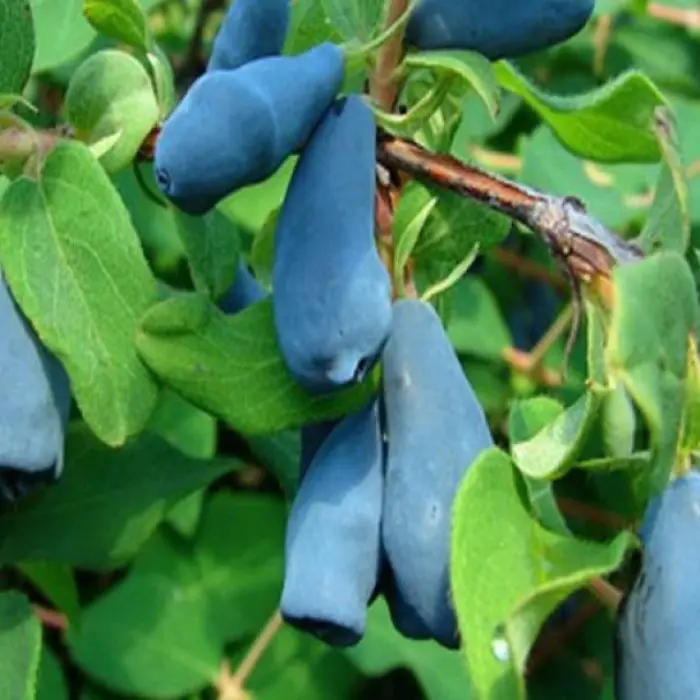 Жимолость Пушкинская. Относится к раннеспелым сортам. Кусты небольшого размера, покрыты листьями особой формы, которые придают им изящной декоративности. Масса ягод округло-цилиндрической формы составляет 1 грамм. Цвет плодов голубовато-синий. Кожица небольшой толщины, покрытая тонким восковым слоем. Ягоды гладкие с незабываемым кисло-сладким вкусом, нежной мякотью и выраженным ароматом, практически не осыпаются (осыпаемость составляет меньше 20%).