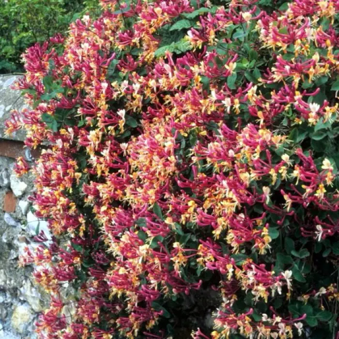 Жимолость вьющаяся Serotina. Лиана высотой 300-400 см, цветки очень ароматные, трубчатые, внутри кремовые, снаружи красновато-пурпурные, цветёт в июне-июле, плоды оранжево-красные, рекомендуется для вертикального озеленения беседок, подпорных стенок, оформления арок, маскировки стволов деревьев и изгородей, место солнечное или полутенистое, почва влажная