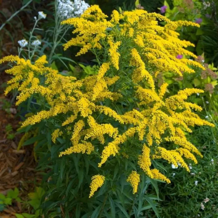 Красивый куст с изумительными золотистыми цветами. Солидаго радует своим цветением в период перехода лета в осень, даря ностальгию по теплым и солнечным дням. Высокие прочные стебли растения достигают высоты 1,7 м, а ветвятся лишь наверху. Эти мелкие веточки и облеплены многочисленными метельчатыми соцветиями из крошечных золотистых цветков. Соцветия длиной до 35 см, цветки ярко-желтые. По виду цветущий золотарник напоминает ветви мимозы в миниатюре. Цветение золотарника продолжается с августа до конца сентября, а отдельные экземпляры цветут и до глубокой осени. Иногда растение уходит в цвету под снег. Осенью уже почти нет медоносов, и к соцветиям золотарника слетаются пчелы и шмели, собирая осенний взяток, весьма ценимый пчеловодами.
