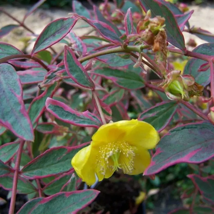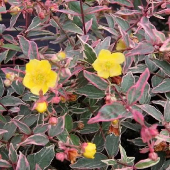 Зверобой Мозера Tricolor. Полувечнозеленый кустарник до 1 м высотой, шириной до 0.8 м. Ветви распростертые, растопыренные. Молодые побеги красновато-зеленые или карминовые. Листья эллиптические, декоративные, трехцветные(зелено-кремово-розовые). Цветки, собранные в конечные, малоцветковые соцветия, ярко-желтые, среднего размера, с многочисленными длинными, далеко выдающимися из цветка тычинками.